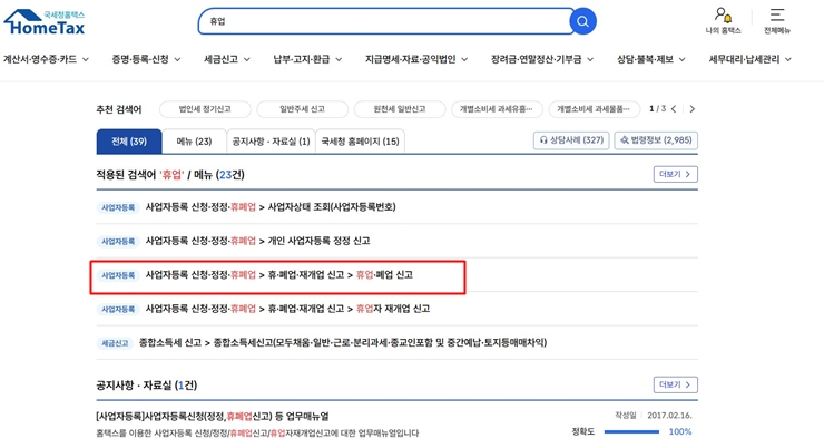 - 신청/제출 → 사업자등록 신청·정정·휴폐업 → 휴·폐업·재개업 신고